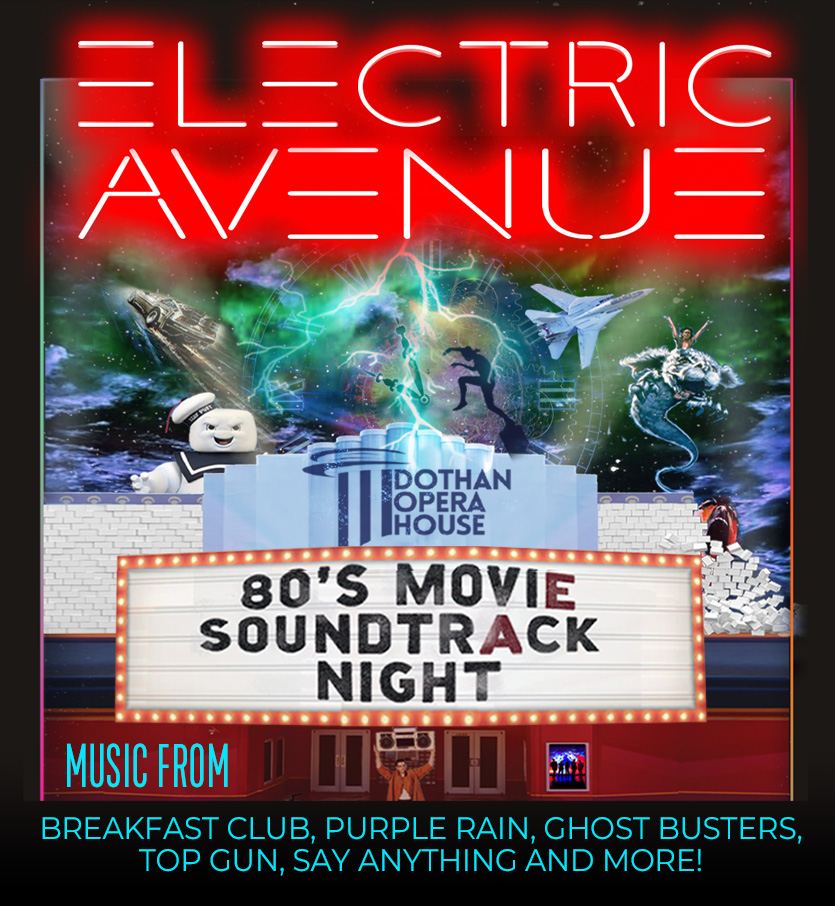 Sit back and relive iconic moments from your favorite 80's movies on the big screen at the Dothan Opera House while Electric Avenue masterfully brings those unforgettable soundtrack hits to life on stage!